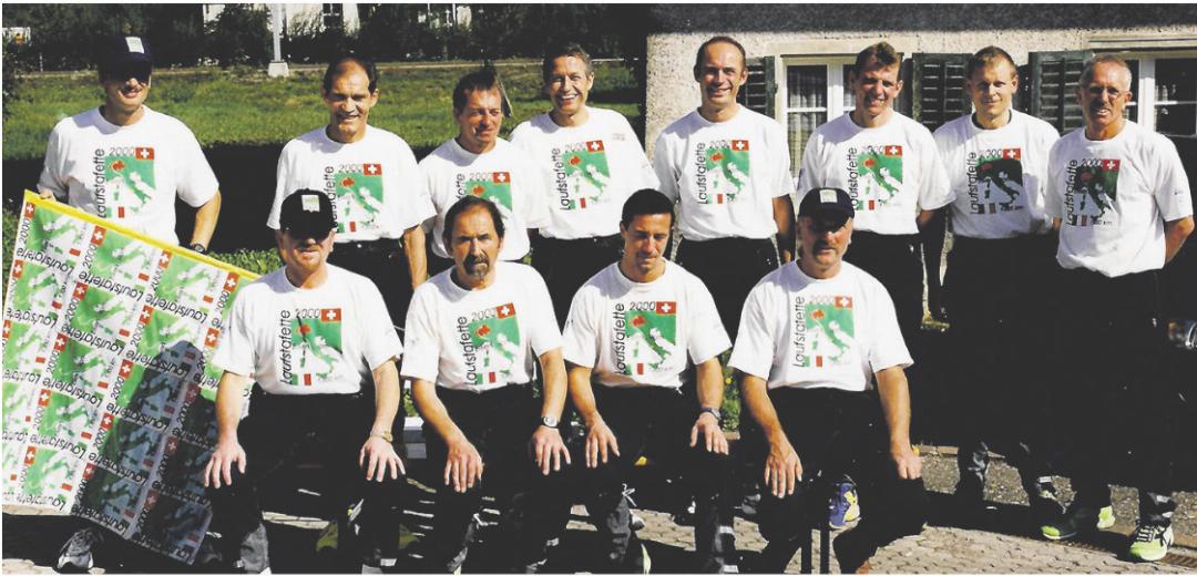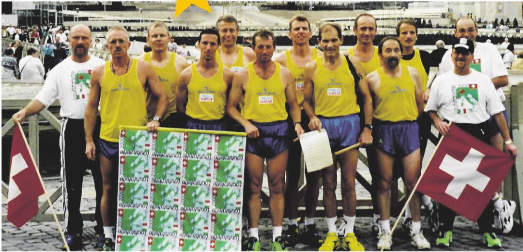 Das Jahr 2000 war ein besonderes Jahr für die katholische Kirche – sie feierte ihren 2000. Geburtstag. Dies bewog die Organisatoren der Laufstafette Eiken–Rom, die Route «auf den Spuren der Römer» zu wählen. Der Prolog startete am 29. September 2000 von Eiken nach Kaiseraugst ins römische Amphitheater. Die nächste Etappe – wie alle weiteren zwischen 150 und 180 Kilometer lang – führte nach Avenches. Für den Weg nach Italien orientierten sich die neun Läufer, stets begleitet von einem Biker aus der Gruppe, an der Westroute der alten Römer über den Grossen St. Bernhard und durch das Aostatal. Drei Busse standen für Transport und Verpf legung im Einsatz. Parallel zur Organisation der Laufstafette wurde das Projekt «Km Sponsorin» lanciert. Die Hälfte des Erlöses ging an den «Verein für Mobilität und behinderte Menschen». «Der Empfang in Rom war unglaublich», erinnert sich Hansruedi Dinkel an den 6. Oktober 2000. In der Heiligen Stadt traf die Schweizer Laufgemeinschaft auf namhafte Persönlichkeiten. Ähnlich eindrücklich waren auch die Begegnungen während der Jubiläumsreise. Zu den Begleitgästen gehörten unter anderem Sylvia und Léon Borer, der ehemalige Kommandant der Kantonspolizei Aargau. «Fünf unvergessliche Tage und Begegnungen – genug zum Erzählen und zum Schwelgen in Erinnerungen», lautet das Fazit der Reise in die Ewige Stadt. Dass sie einen Tag länger als erwartet dort verbrachten, hatte mit dem Streik der italienischen Bahn zu tun.