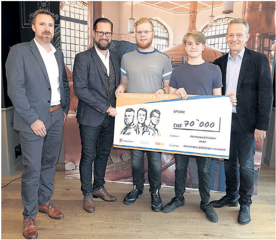 Weil Coop und Feldschlösschen auf den Erlös verzichteten, kamen so 70 000 Franken zusammen. Am Dienstag übergaben die Lehrlinge Jan Männl und Laurin Scognamiglio einen entsprechenden Check an Marcel Kreber, Direktor des Schweizerischen Brauerei-Verbandes. Das Geld soll für die Nachwuchsförderung eingesetzt werden. «Wir sind daran, die Ausbildung neu aufzugleisen und attraktiver zu machen», erklärt Kreber. Dazu soll unter anderem in Rheinfelden bei Feldschlösschen eine Lernwerkstatt eingerichtet werden, von der Lehrlinge aus der ganzen Schweiz profitieren können.