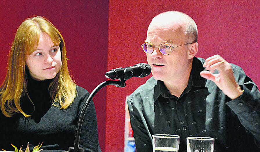 27.10.2022 Kultur, MöhlinMit Spannung erwarteten rund 30 Besucherinnen und Besucher am Freitag die Lesungen des Buchautors, Texters und Satirikers Willi Näf im Reformierten Gemeindezentrum in Zuzgen. Die Teilnehmenden liessen sich in die spannenden Biografien und fiktiven Interviews von elf prominenten Verstorbenen hineinnehmen, die Willi Näf im Buch «Seit ich tot bin, kann ich damit leben» aufgezeichnet hat. Es geht darin um so unterschiedliche Persönlichkeiten wie die Grossmutter von Donald Trump, das entführte Kleinkind des Flugpioniers Charles Lindbergh oder einer Überlebenden des dramatischen Trecks über den Donner-Pass in den Rocky Mountains. Die Interviews las der Autor zusammen mit seiner Tochter Leonie.