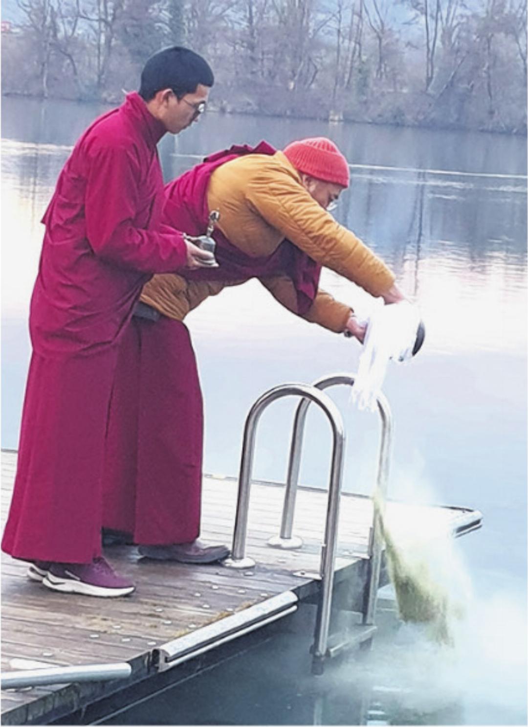 Im Schwimmbad traten die beiden mit der Schale auf den Steg und streuten von dort, wieder fotografiert und gefilmt von vielen Handys, den Sand in den Rhein. «That’s it, have a good day», rief der Abt zum Abschied. Auf dem Rückweg wurde der junge Lama gefragt, ob er eigentlich so etwas wie Trauer empfinde, wenn das Werk, an dem er so lang und konzentriert gearbeitet hatte, im Nu wieder weg sei. Er habe keine Anhaftungen, sagte er und wechselte dann das Thema: Er sei begeisterter Fussballer, gehöre zum Team seines Klosters, das gegen andere Klostermannschaften spiele; jedes Wochenende werde gespielt. Er interessiere sich auch für internationalen Fussball, kenne alle bekannten Schweizer Spieler, Yann Sommer, Manuel Akanji, Granit Xhaka, Xherdan Shaqiri, von dem er gehört habe, dass er in Kaiseraugst wohnt. Wenn er wieder in die Schweiz komme, um ein Mandala zu streuen, werde er ihn um ein Autogramm bitten. (mgt)