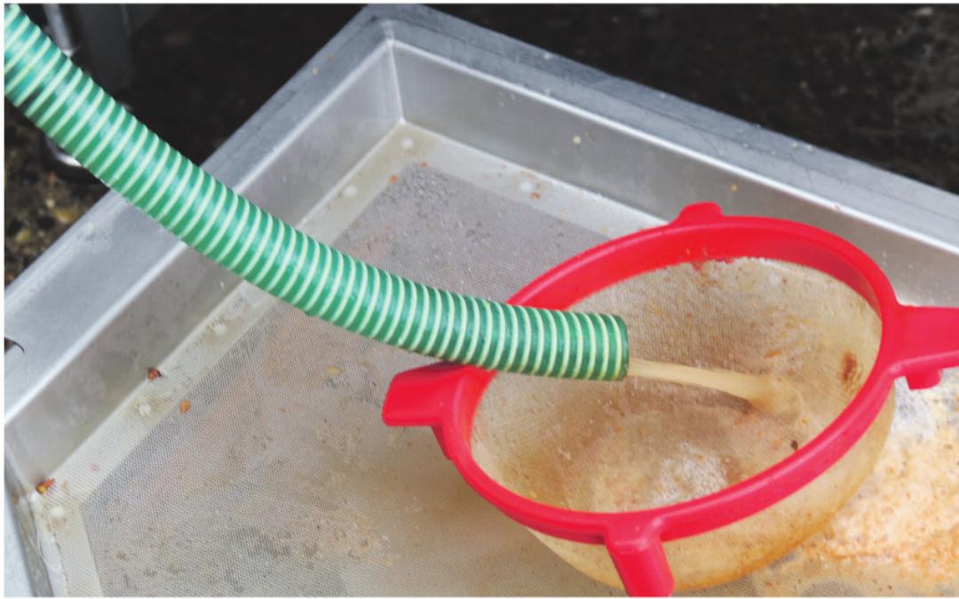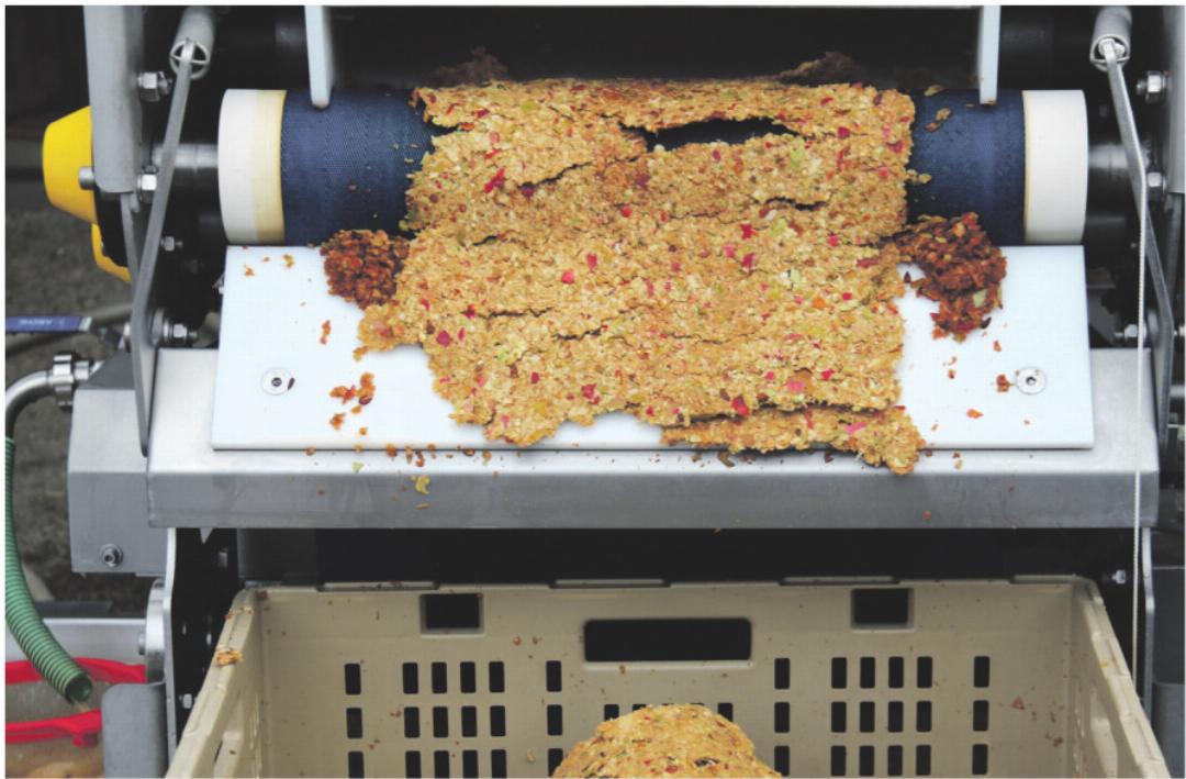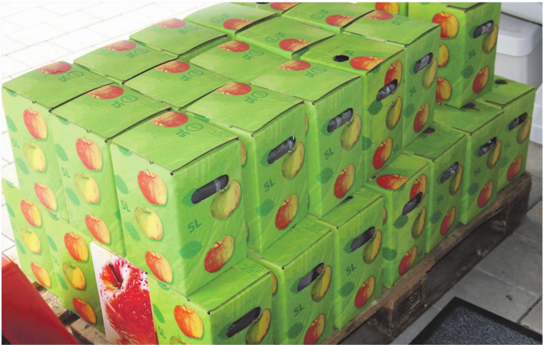 Mit der Presse von André Abt lassen sich pro Stunde 500 bis 600 Liter Fruchtsaft gewinnen. In Behältern gesammelt, wird er geklärt, geläutert. Am Folgetag hat sich die Druse abgesetzt, die Feststoffe schwimmen nicht mehr und der Most ist geniessbar. Damit er in der Folge auch für lange Zeit süss haltbar bleibt, wird er pasteurisiert. Er wird dafür mit einem Durchlauferhitzer auf 78 Grad erwärmt und in die vom Kunden gewünschten Behältnisse abgefüllt. Bei André Abt sind das Bags mit drei, fünf oder zehn Litern Fassungsvermögen. Das Leistungsvermögen des Durchlauferhitzers liegt bei 300 Litern pro Stunde.