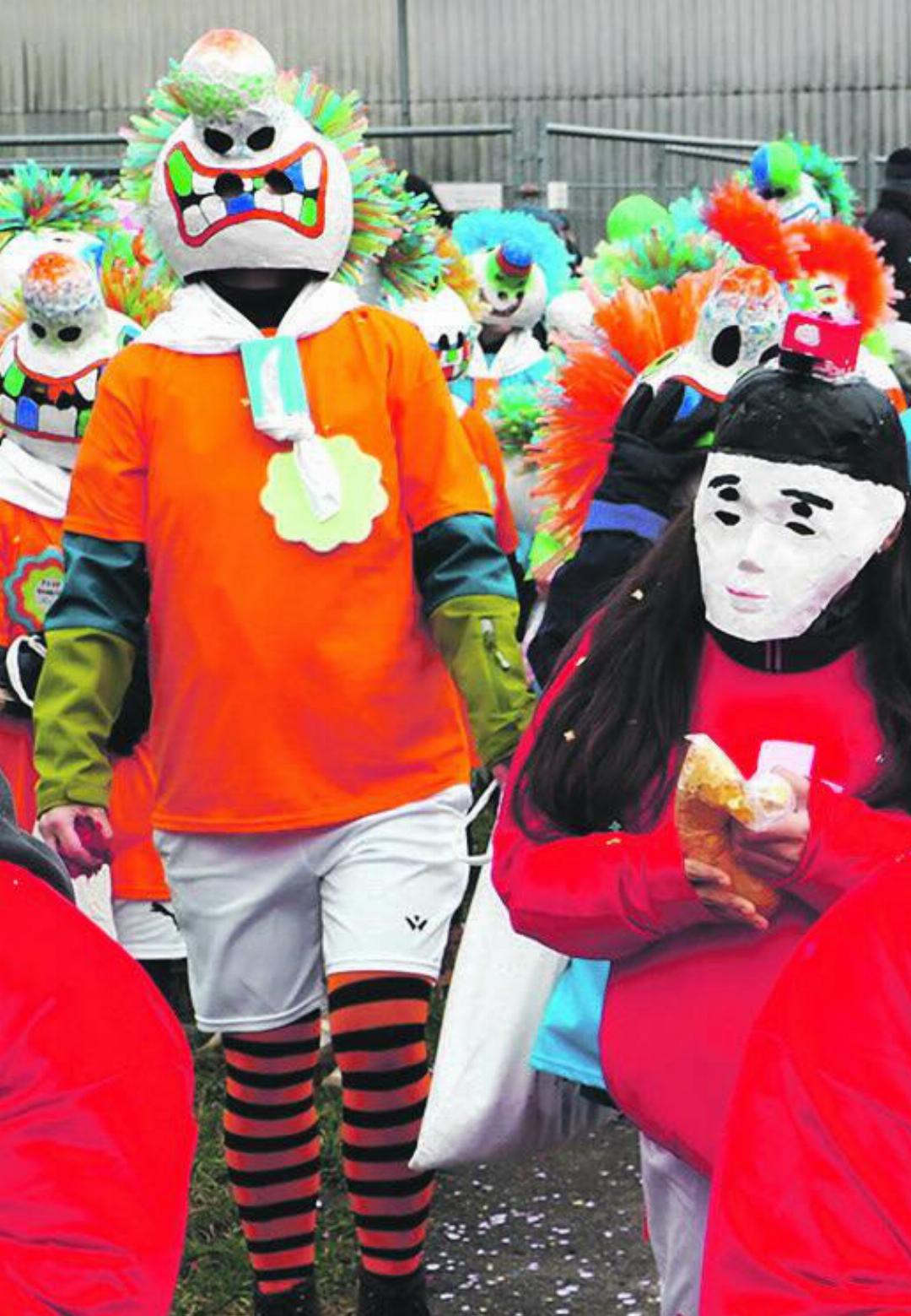 Das Resultat liess sich sehen. Die Klassen präsentierten unterschiedlichste Verkleidungen, welche von einem grossen Ideenreichtum und lebensfrohem Narrenwitz zeugten. Da waren Maulwürfe, Frösche, Waggis, Piraten, Minions, Regenbogenfische, Gartenzwerge, Popcorntüten, Tippkicker, Emojis, Astronauten und Schlümpfe zu sehen. Den Kindern, welche auf dem Umzug durchs Dorf von den Zuschauenden nicht zu knapp mit Konfettis beschenkt wurden, war von weitem anzumerken, dass sie das Fasnachtsfieber gepackt hatte. Die «Räblüüs» führten diesen bunten Haufen auf einer gut organisierten Route durchs Dorf. Hie und da gab es ein Platzkonzert, bei welchem die Guggenmusik nicht nur zeigte, was sie musikalisch draufhat, sondern auch einige f lotte Showeinlagen präsentierte. Nach der Rückkehr auf den Schulhausplatz standen für alle ein leckerer Imbiss und warme Getränke bereit. Die Schulleitung, der Hauswart und einige Lehrpersonen sorgten dafür, dass alle ihre wohlverdiente Fasnachtsstärkung bekamen. (mgt)