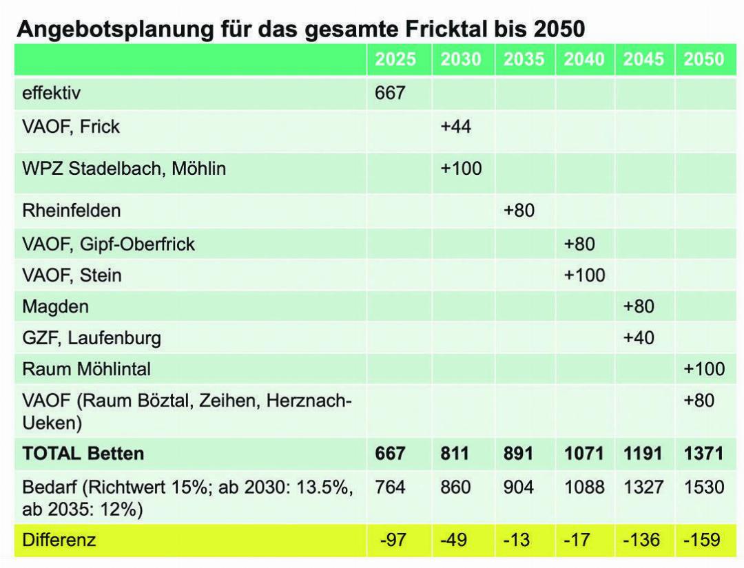 «Die Fricktaler Alters- und Pflegeheime sind heute zu 97,3 Prozent ausgelastet», erklärte Mazzi. Der Bedarf an Pflegebetten werde in den kommenden Jahren deutlich steigen. 2012 lebten 3114 Personen im Alter von 80 Jahren oder älter im Fricktal. Zwölf Jahre später sind es bereits knapp 5000. Laut Prognosen wird die Zahl der über 80-Jährigen bis 2050 auf rund 12 500 anwachsen. Damit verdoppelt sich auch der Bedarf an Pflegebetten. Hierzu warf Mazzi die Frage auf: «Wo sollen neue Pflegeheime entstehen?» Zum einen müssten einige der aktuell elf Fricktaler Alters- und Pflegezentren ausgebaut werden, zum anderen brauche es zusätzliche solcher Einrichtungen. Auch Gemeinden, die bisher nicht als Standortgemeinden in Betracht gezogen wurden, könnten künftig gefordert sein.
