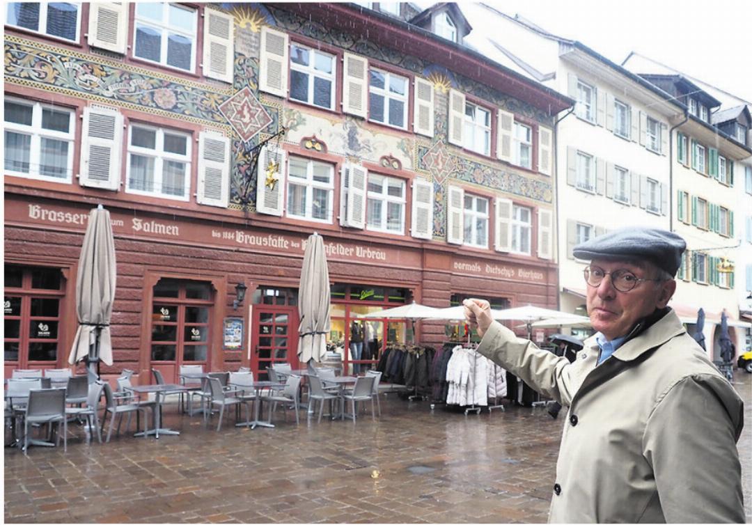 Heute steht Carlo Habich im Gespräch mit der NFZ vor dem Stammhaus des Salmenbräus in der Marktgasse 10. Es ist ein aussergewöhnlich breites Gebäude: Tatsächlich waren es ursprünglich drei, die Ende des 18. Jahrhunderts vereint wurden. Unter den vielen Ornamenten der farbigen Fassadenbemalung stechen zwei Hexagramme hervor, das heute oft mit dem Davidstern verwechselte Zunftsymbol der Winzer und Brauer, mit einem Lachs darin. Dasselbe Emblem hängt als goldenes Wirtshausschild auf die Strasse hinaus. Auf dem Querbalken des Erdgeschosses steht die Aufschrift «Brasserie zum Salmen – bis 1884 Braustätte des Rheinfelder Urbräu – vormals Dietschy’s Bierhaus». Heute haben sich im Erdgeschoss ein Bistro und ein Kleiderladen eingerichtet; die oberen Stockwerke sind zu Wohnungen ausgebaut.