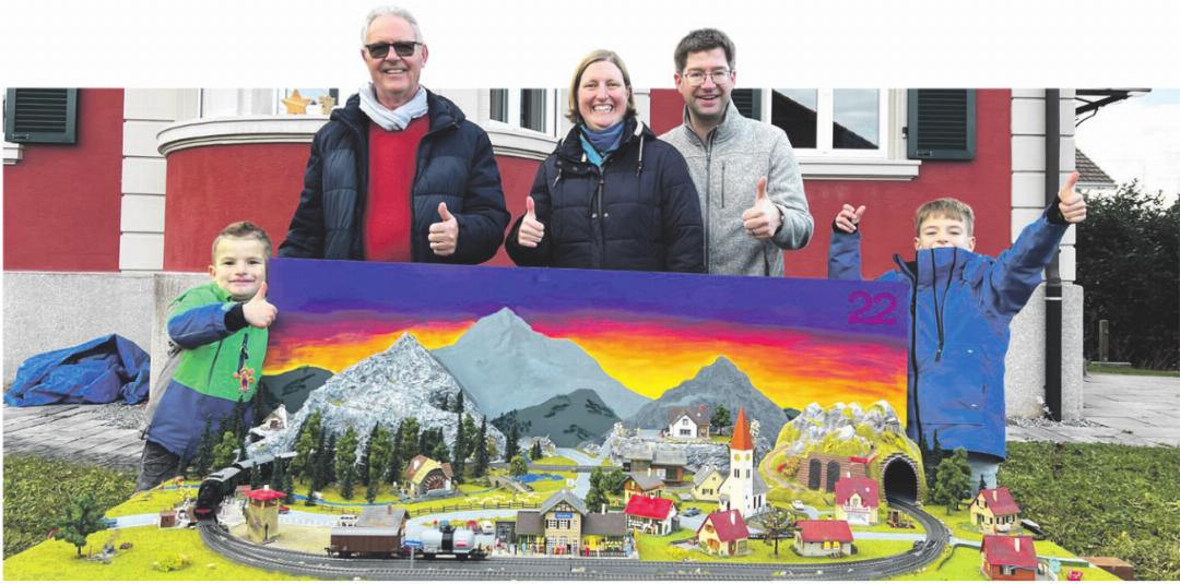 Auch Familie Käslin hat viel Herzblut in ihr Projekt investiert. Drei Generationen haben seit Anfang November etliche Stunden mit Basteln, Malen, Studieren, Kleben und Lachen verbracht. Die Box wurde eigens für dieses Diorama von Papi Fabian gefertigt. Cornelia erklärt: «Fabian war für das Grobe zuständig, er hat die Box gemacht und den Gartenzaun entfernt. Grosspapi Kurt hat die Eisenbahn und die ganze Elektrizität installiert und ich habe mit unseren Söhnen Niklas und Yannik die Bastelarbeit übernommen. Eigentlich wollten wir zuerst eine Krippe basteln. Wie es der Zufall aber so wollte, sind wir am Chilbi-Flohmi auf eine Box mit Häusern samt Bahnhof gestossen. Wir haben spontan umdisponiert und uns für diese Schweizer Berglandschaft entschieden. Fast alles haben wir in mühevoller Kleinst- und Bastelarbeit von Hand gefertigt. Die Schitterbiig zum Beispiel haben wir aus Holzkörbchen vom Coop zugeschnitten.»