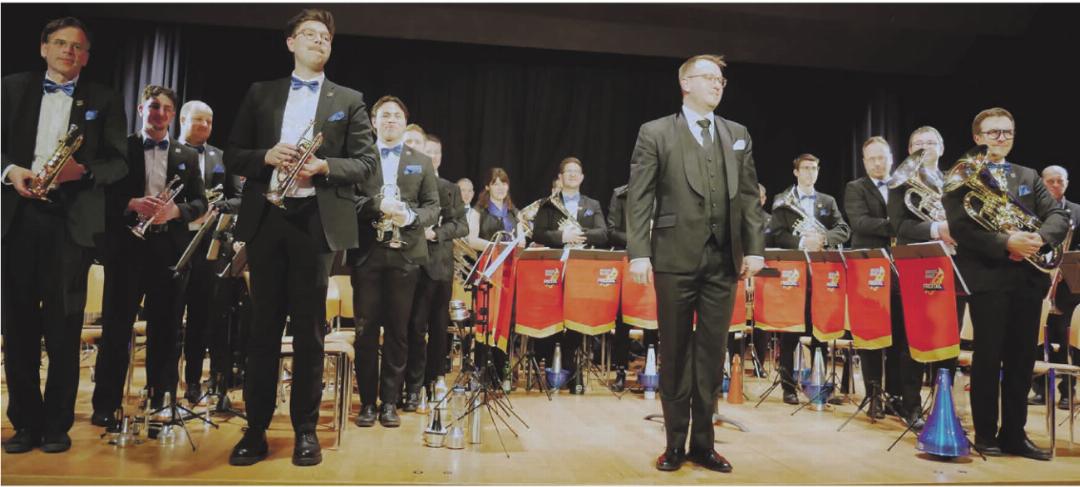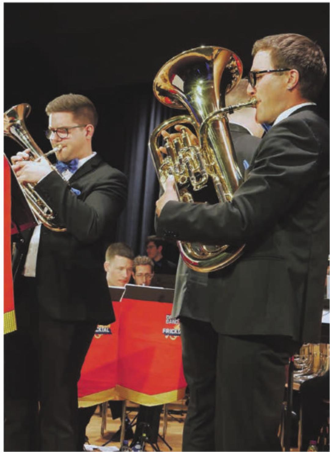 Etwas weniger provokant, aber ebenfalls reich an Facetten war John Williams’ «Cowboy-Ouvertüre». «Die Musik schmeckt nach Leder, Staub, Abenteuer, Westernromantik», so der Moderator. Unterhaltender, aber deshalb nicht weniger niveauvoll, ging es nach der Pause weiter. Auf das einleitende Werk «Horizons» von Paul Lovatt-Cooper folgte das kurze, aber heftige und ohne Handbremse gespielte «Misiriou» von Bertrand Moren, basierend auf der Volksmusik des östlichen Mittelmeerraums. Als Solisten brillierten die, so Raffael Wagner, «schnellsten Zungen des Fricktals», namentlich Kai Vögele (Es-Horn) und Elias Mühlebach (Euphonium), die ihren nicht gerade kleinen und auch nicht unbedingt leichtgängigen Instrumenten ganze Salven an Staccati entlockten und sich in fesselnde Dialoge verwickelten, dabei stets die nötige Leichtigkeit und auch Durchsetzungsstärke gegenüber dem Orchestercrescendo bewiesen. Diese Leistung verdiente den besonderen Beifall des Publikums.