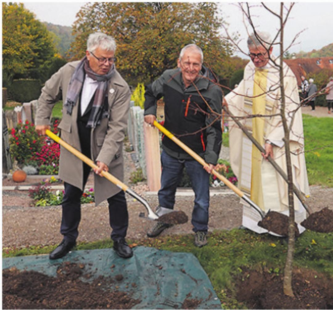 Nach dem Gottesdienst setzen die Anwesenden ein Zeichen der Gemeinsamkeit, in dem sie eine Linde pflanzen. Der Ableger stammt von der grossen Linde vor der Pfarrschür aus Magden. Die Gottesdienstbesucher haben fleissig mitgeholfen, die Linde auf dem oberen Friedhoffeld einzupflanzen. So auch der Gemeindeammann aus Obermumpf Benedikt Gürtler und der Kirchenpflege Präsident von Magden Jürg Waldmeier. Den Anlass schlossen die Teilnehmer mit einem gemütlichen Apéro vor der Kirche ab. (mgt)