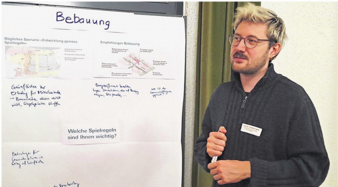 Im Anschluss war die Zuhörerschaft aufgefordert, eigene Ideen und Vorschläge zu den drei Bereichen zu äussern und mit den Fachpersonen zu diskutieren. Dieses Angebot wurde gerade zum Thema Verkehr und Parken besonders intensiv genutzt. Shuttleservice, fahrerloses Fahren, Anzahl der Parkplätze und Zahl der Zubringeranschlüsse, und was bedeutet das alles für die Grundeigentümer. Der Abend war von einem regen Austausch und einer intensiven Teilhabe geprägt, auch wenn manche Fragen, wie die von Grundeigentümer Robert Weniger aus Stein unbeantwortet blieben.