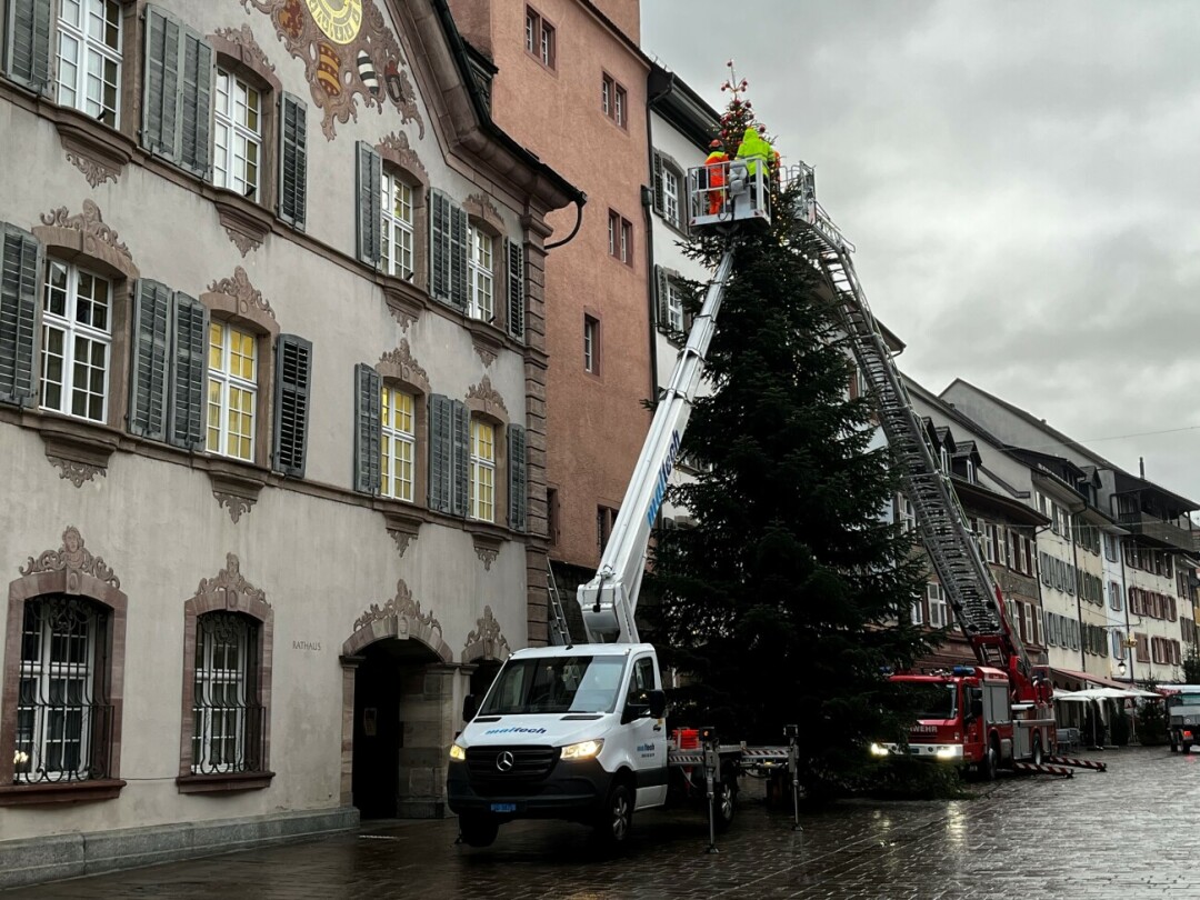 25.11.2025 BrennpunktEs weihnachtet sehr in Rheinfelden. Um die Tanne vor dem Rathaus zu schmücken, braucht es auch ein Feuerwehrauto. Bald erstrahlt der Baum in vollem Glanz.