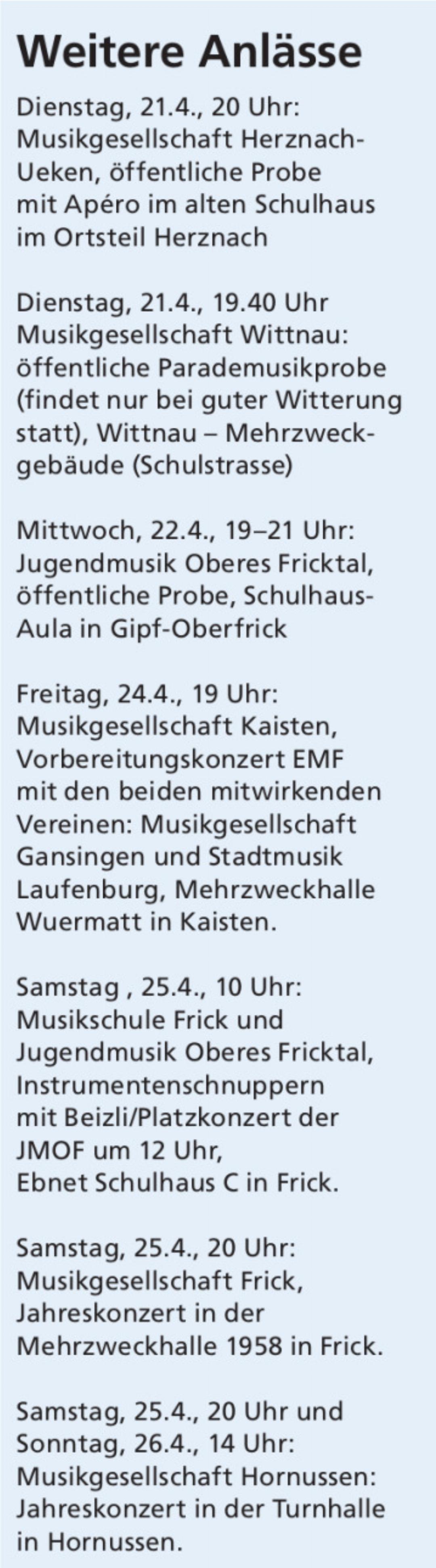 Die Freude am gemeinsamen Musizieren niederschwellig zu vermitteln – das steckt hinter der Aktion «Blosmusig-Woche – taktvoll unterwägs». Die ganze Woche hindurch bis zum kommenden Sonntag finden in den Dörfern weitere Konzerte statt. Nach dem Flashmob am Samstag in Frick folgte am Sonntag ein Platzkonzert der MG Gipf-Oberfrick. Am Montag lud die MG Asp zu einer öffentlichen Parademusikprobe mit Treffpunkt beim Restaurant Jura ein, und die MG Wölflinswil-Oberhof bot in der Turnhalle Wölf linswil einen Instrumentenplausch mit offener Probe an (weitere Konzerte und Veranstaltungen siehe Kasten).