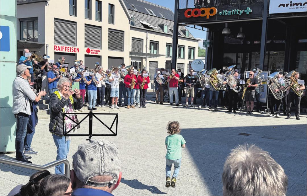 «So schön, dass so viele gekommen sind», freute sich Jeannette Näf am Samstagmorgen kurz nach 11 Uhr. Sie meinte damit insbesondere das Publikum, das die musikalische Einlage auf dem Platz vor dem Coop sichtlich genoss und die Musikerinnen und Musiker mit entsprechendem Applaus belohnte. Jeannette Näf gehört zusammen mit Niklaus Beck und Fiona Näf dem OK der «Blosmusig-Woche» an. Normalerweise begegnen sich die Mitglieder der Trägervereine der Jugendmusik Oberes Fricktal an Sitzungen und Besprechungen. An diesem Morgen jedoch gaben nicht Mitglieder eines, sondern gleich mehrerer Blasmusikvereine aus dem oberen Fricktal gemeinsam auf dem Coop-Platz den Ton an. Die Besonderheit des gemeinsamen Musizierens der verschiedenen Blasmusikvereine hoben die drei OK-Mitglieder am Samstagmorgen ebenfalls hervor.
