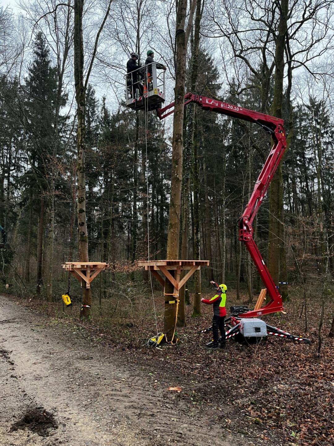 Es wird fleissig gearbeitet im Rheinfelder Waldgebiet Wasserloch. Hier, in der Nachbarschaft der Sportanlagen Schiffacker, entsteht in den kommenden Monaten ein neuer Waldseilpark; der aktuell einzige im Kanton Aargau. Die ersten beiden Plattformen des Kinderparcours sind bereits zu erkennen. «Am 5. Januar haben wir mit den Arbeiten begonnen. Es läuft gut», erklärt Reto Schweizer. Er ist Geschäftsleiter der Firma «Adventure Coaching & Rope Solutions GmbH», welche den Rheinfelder Seilpark bauen und betreiben wird. In den ersten Tagen haben Baumpf leger Totholz und Efeu entfernt. Jetzt laufen bereits die eigentlichen Bauarbeiten.