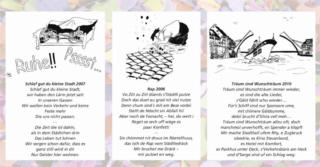 Nicht ganz von Anfang an dabei war Anita Schraner. «Wir haben ja gar keine Helgen. Kannst Du malen?» «Nein!» «Ich auch nicht!» «Aber Anita Schraner kann es!» Monika Spring und Ilse Jehle schmunzeln in Erinnerung an diese kurzen Dialoge, welcher der Anfrage an Salmfänger-Mitglied Anita Schraner, eine sehr begabte Zeichnerin, vorausgingen. Anni Jehle blieb zwei Jahre in der Schnitzelbank-Gruppe. Seither sind die «Salm-Tratschä» zu dritt unterwegs.