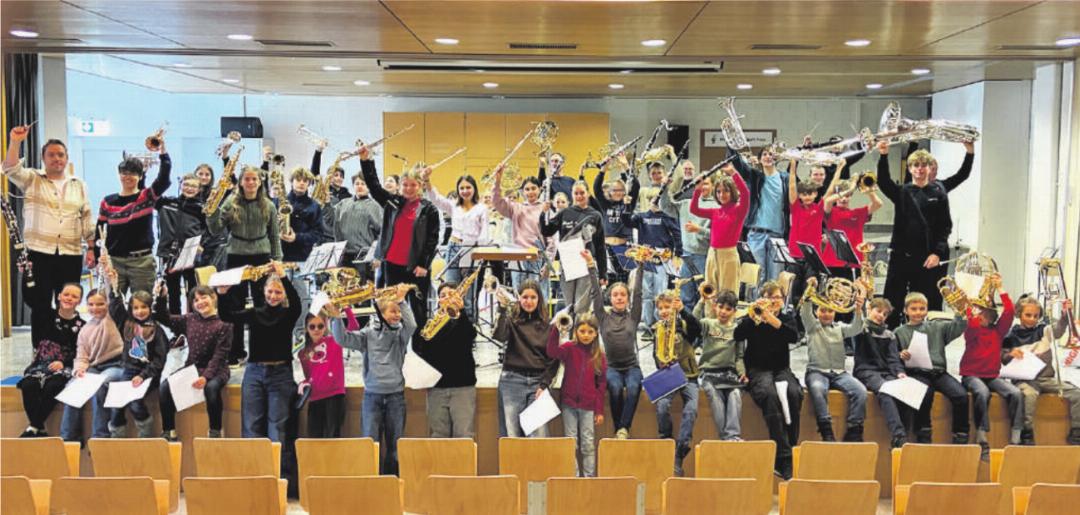 Rund 60 Schülerinnen und Schüler fanden sich am vergangenen Samstagmorgen zum Projekt-Workshop «Brass and Wood together» in der Aula des Oberstufenschulhaus Ebnet ein.