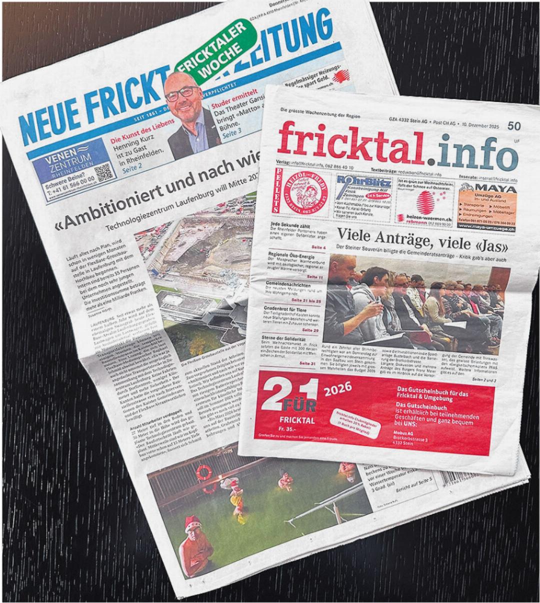 18.12.2025 FricktalAnfang Woche wurde bekannt, dass die beiden wöchentlich im ganzen Fricktal erscheinenden Zeitungen «Neue Fricktaler Zeitung/Fricktaler Woche» und «fricktal.info» im nächsten Jahr zusammenarbeiten. Aus zwei mach eins. Die ersten Reaktionen fallen positiv aus.