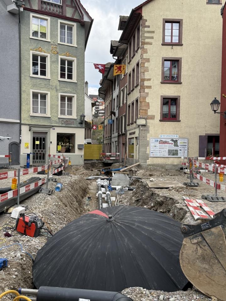 30.03.2026 LaufenburgWer zurzeit in der Laufenburger Altstadt von der Fischergasse Richtung alte Rheinbrücke gehen oder fahren möchte, steht sprichwörtlich am «Abgrund». Im Zuge der Werkleitungssanierung ist diese Strasse gesperrt. Die Umgehung, beziehungsweise Umfahrung ist signalisiert.