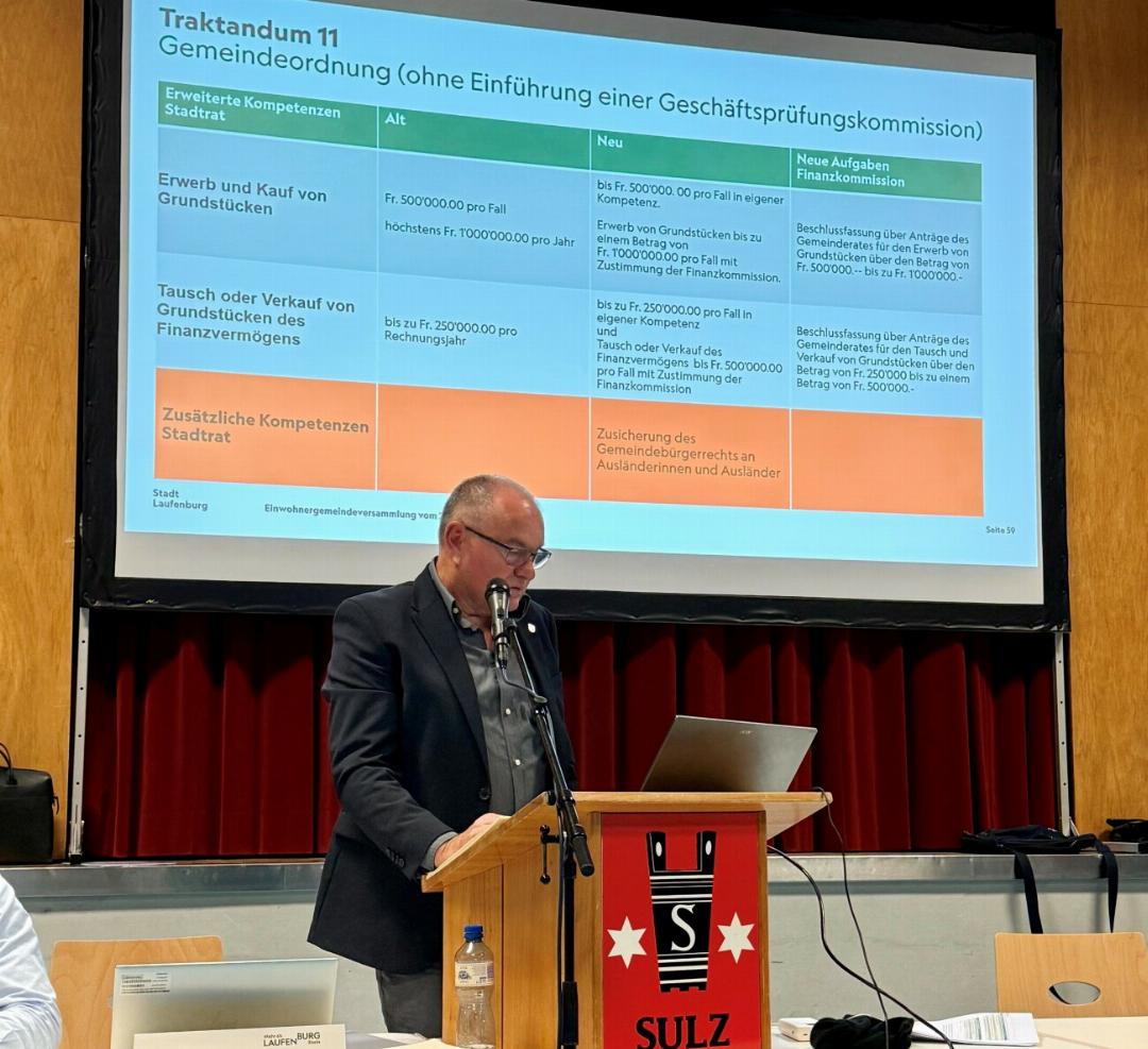 22.11.2025 LaufenburgAnfänglich sah es am Freitagabend ganz danach aus, dass schon früh zum angekündigten Apéro gewechselt werden könnte. Zügig passierten die ersten Traktanden, teils mit wenigen, teils mit gar keinen Diskussionen die Laufenburger Einwohnergemeindeversammlung in der Sulzer Turnhalle (179 von insgesamt 2018 Stimmberechtigten waren anwesend). Für eine etwas längere Diskussion sorgte die vom Stadtrat zur Ablehnung empfohlene Projektierung in Höhe von 15 000 Franken für die Einführung von Tempo 30 in den Quartieren der Ortsteile Rheinsulz und Sulz. Letztlich folgte die Versammlung dem stadträtlichen Antrag und lehnte den Kredit ab.