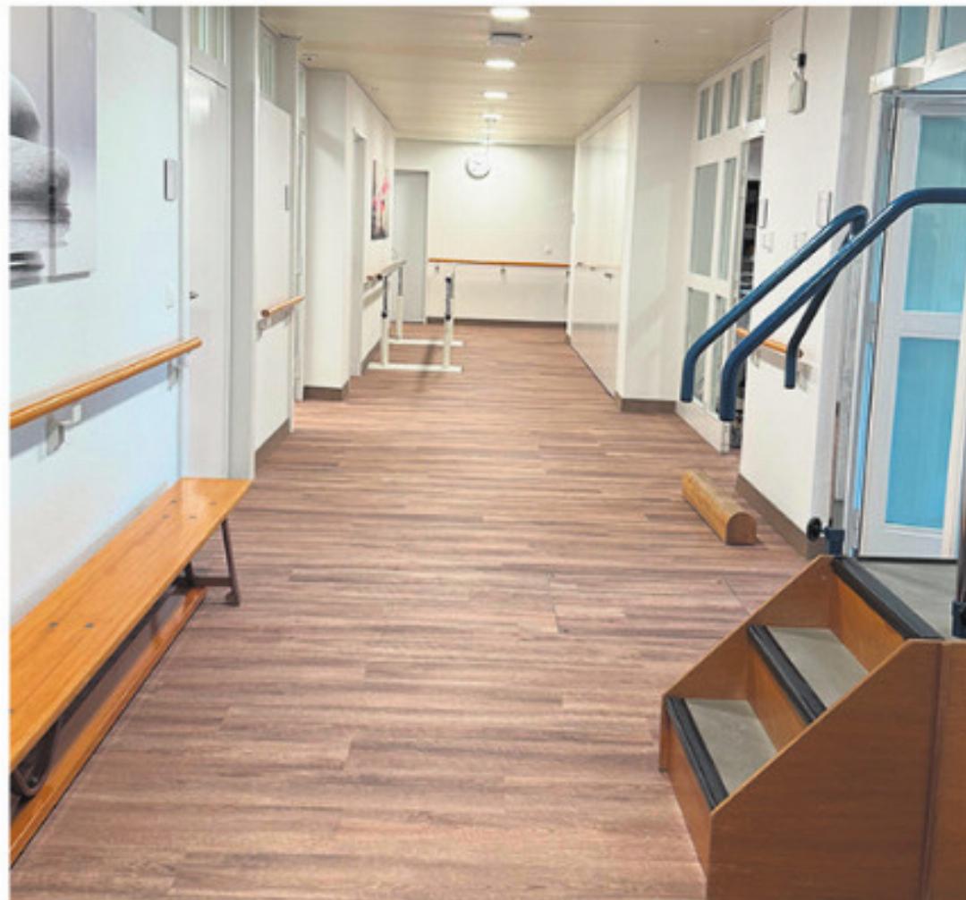 Der Rundgang durch die hellen Räume – trotz Untergeschoss sorgen grosse Fensterfronten und ein ausgeklügeltes natürliches Beleuchtungssystem für viel Licht – lässt Besucherinnen und Besucher staunen. «Wow, so gross», ist ein häufiger erster Eindruck. Lange, breite Gänge mit Böden in Holzoptik führen zu zahlreichen Behandlungsund Aufenthaltsräumen. «Für Patientinnen und Patienten wie auch für die Therapeutinnen und Therapeuten ist alles viel freundlicher geworden. Die Resonanz ist durchweg positiv», freut sich Bettina Fenner. Sie bestätigt, dass das Team sich bei den Umbauplänen einbringen konnte – etwas, das auch Marcus Bartsch, Standortleiter des Spitals Laufenburg, als sehr wichtig hervorhebt.