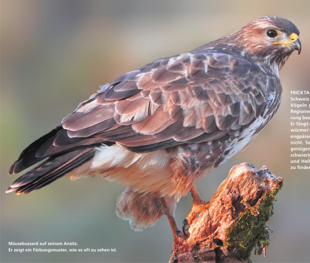 Der Mäusebussard ist der am häufigsten in der Schweiz vorkommende Greifvogel. Zu den heimischen Vögeln gesellen sich im Winter solche aus nördlichen Regionen, die in unseren Breiten überwintern. Seine Nahrung besteht vor allem aus Kleinsäugern wie Mäusen etc. Er fängt aber auch Reptilien und Amphibien. Auch Regenwürmer gehören auf seinen Speiseplan. Bei Nahrungsengpässen verschmäht der schöne Greifvogel sogar Aas nicht. Selbst im Winter finden Mäusebussarde bei uns genügend Nahrung. Nur bei langem Dauerfrost wird es schwierig für sie. Mäusebussarde variieren stark in Farbe und Helligkeit. Von fast weiss bis dunkelbraun ist alles zu finden.