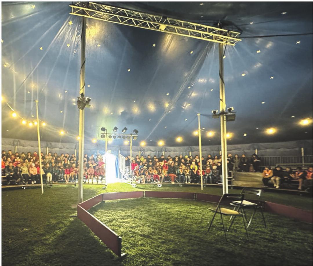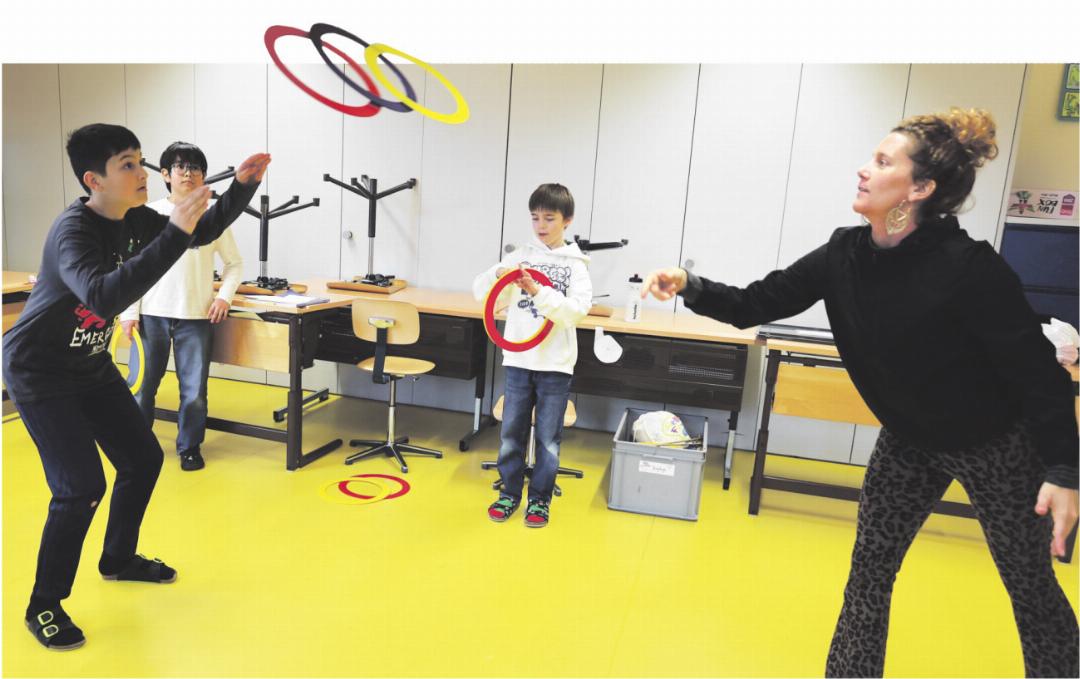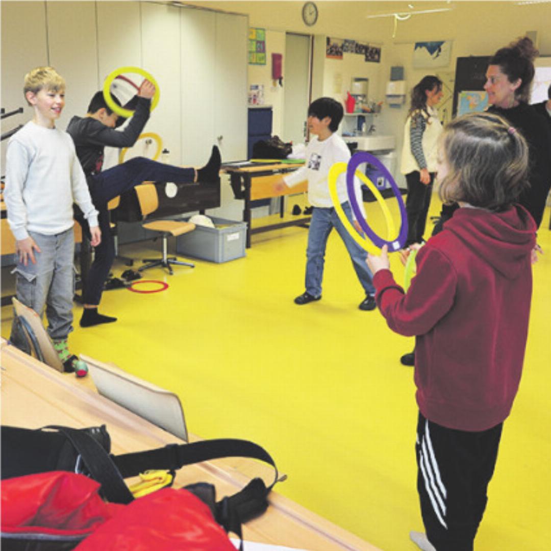 Montag sind alle Kinder (vom Kindergarten bis zur 6. Klasse) daran, sich gemeinsam mit ihren Lehr personen und den Artistinnen des Circus Balloni in zwölf Zirkusgruppen auf die grossen Shows von morgen Freitag vorzubereiten.