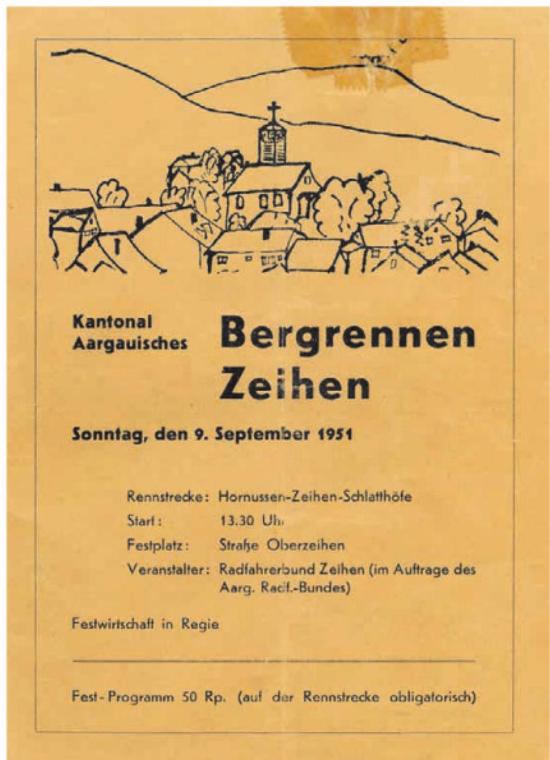 Am 9. September 1951 wurde der Anlass vom Radfahrerbund Zeihen, wie der Verein damals noch hiess, organisiert. Die Festschrift von anno dazumal vermittelt einen lebendigen Eindruck der Veranstaltung. In seinem «Gruss und Willkomm» schrieb der Radfahrerbund Zeihen gemeinsam mit dem Organisationskomitee: «Der Verein freut sich und fühlt sich geehrt, mit der Durchführung vom Kantonalen Bergrennen beauftragt worden zu sein.» Unter dem Motto «Lustig und froh, alle Radler sind so» sei es der innigste Wunsch des OKs gewesen, dass Radfahrer, Radsportfreunde und Festbesucher «ein paar schöne und unvergessliche Stunden» erleben können. Ein Blick ins damalige Programm zeigt, wie stark der Anlass im Dorfleben verankert war: Der Tag begann bereits um 6.45 Uhr mit einer Frühmesse sowie einem Gottesdienst um 9 Uhr. Gestartet wurde – wie heute – in Hornussen. Am Nachmittag traten Junioren, Senioren und Amateure zum Rennen an. Doch damit nicht genug: Ab 15 Uhr wurde «bei rassigem Tanzorchester» in der Festhütte getanzt, ergänzt durch Darbietungen von Vereinen und Reigenmannschaften. Den Abschluss bildete ab 20 Uhr ein «grosser bunter Abend», unter anderem mit Einlagen der mehrfachen Schweizer Meister, den Freien Radlern Dietikon, die mit 6er-Reigen und Kunstfahren begeisterten.