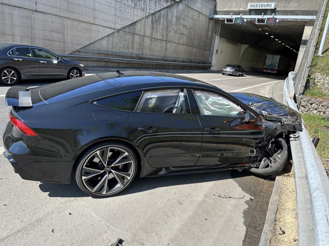 In einem Audi RS7 war der 30-Jährige am Donnerstagmittag, 16. April, auf der A3 in Richtung Basel unterwegs. Auf dem Überholstreifen fahrend, geriet er gegen 11.30 Uhr bei Scherz nach rechts und kollidierte seitlich mit dem Anhänger eines Sattelschleppers. Dadurch kam das Auto ins Schleudern und prallte unmittelbar vor dem Eingang des Habsburgtunnels heftig gegen die Randleitplanke.