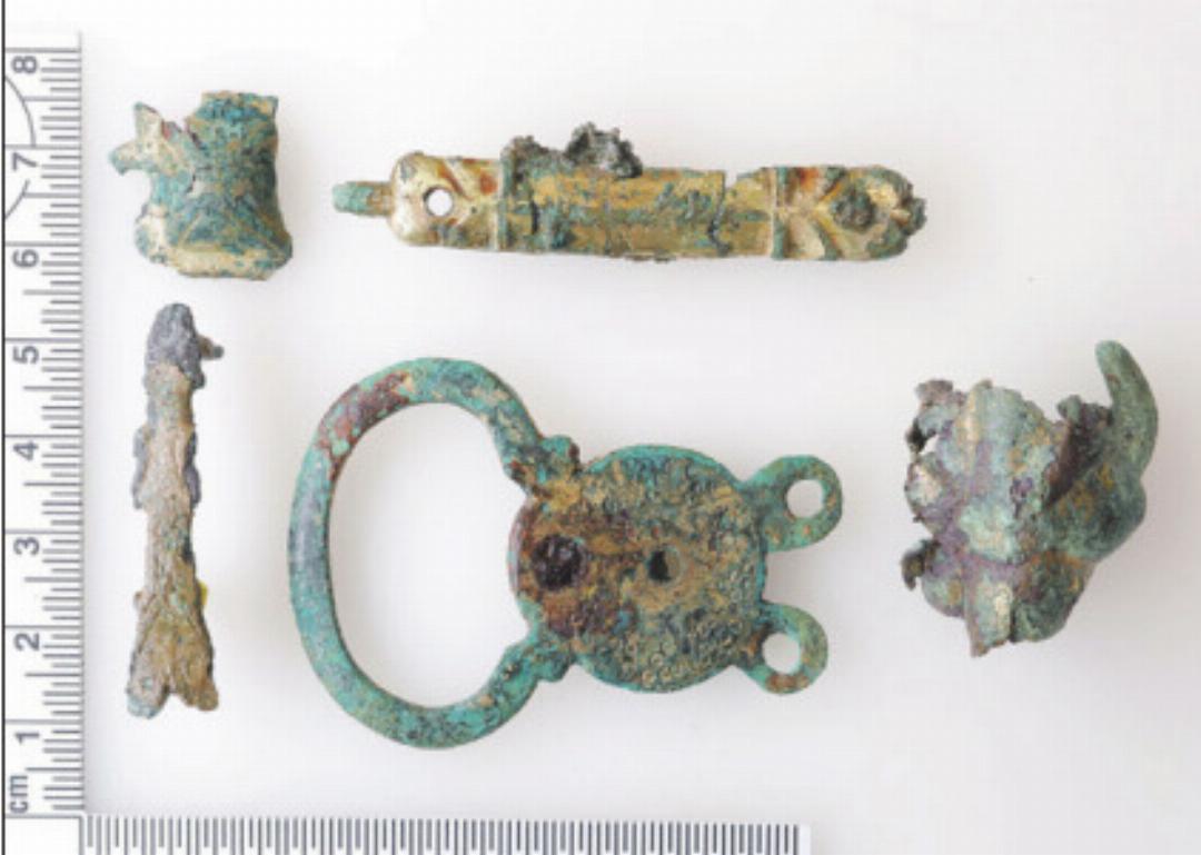 Die Eisenerzvorkommen des Fricktals brachten bis ins 17. Jahrhundert Wohlstand in die Region. Die Herrenhöfe in Herznach und Wölflinswil lagen mitten in den Erzrevieren: Vermutlich sass hier die Obrigkeit, bevor sie auf die Burgen zog. Vom Wohlstand der Region erzählen die wertvollen Funde, die das Grabungsteam in Wölf linswil bergen konnte. Diese sind in der Vitrine «Aktuell» im Vindonissa-Museum in Brugg ausgestellt. Ein besonderes Schmuckstück aus der Zeit zwischen 950 und 1050 war eine Scheibenfibel aus Buntmetall mit farbigen Emaille-Einlagen. In der Mitte ist das Lamm Gottes eingraviert. Vermutlich wurde sie von einer wohlhabenden Frau getragen. Vergoldete Beschläge stammen aus dem 11. bis 12. Jahrhundert, darunter eine Gürtelschnalle und Beschläge von Schatullen oder Teile von Pferdegeschirr. Es sind Objekte, die sich nur eine kleine Oberschicht leisten konnte. Deshalb finden sie sich sonst nur auf Adelsburgen. Ebenfalls ausgestellt sind aus dem Elsass importierte Keramik und verschiedene Münzen.