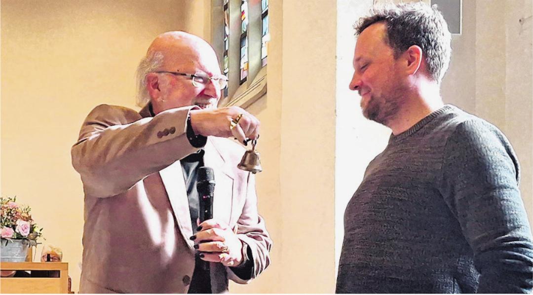 Im Nachklang der Predigt folgte eine musikalische Überraschung: Der «katholische Kirchenchor Plus» unter der Leitung von Armin Böck sang ein eigens für diesen Anlass komponiertes Werk von Winfried Meier Ehrat. Das «Plus» im Namen des katholischen Kirchenchors bezieht sich auf eine grössere Schar Reformierter, die darin mitsingen. Einer von ihnen ist Achim Roloff, der scheidende Präsident der reformierten Kirchgemeinde Region Rheinfelden. Tom Steiner, sein langjähriger Vize, dankte ihm mit herzlichen Worten für sein Engagement und seine umsichtige, kompetente und stets gelassene Leitung. Dass Roloff auch über viel Humor verfügt, zeigte sich in seiner anschliessenden Dankesrede: Er nahm ein kleines Glöcklein aus der Tasche. Das habe ihm seine Vorgängerin, Catherine Berger, einst geschenkt. Er habe es gut gebrauchen können: «In der Kirchenpflege besteht manchmal grosser Redebedarf, oft auch in Bezug auf Themen, die nicht auf der Traktandenliste stehen. Da hat mir das Glöcklein jeweils gute Dienste erwiesen», sagte Roloff und überreichte es seinem Nachfolger.