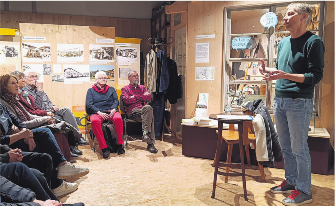 Während dem Projekt «Vom Flachs zum Leinenstoff» begegneten den beteiligten Personen bei den einzelnen Verarbeitungsschritten mehrfach auch Begriffe wie Chuder, brechen, hecheln oder auch spinnen. Christian Schmutz nahm diese Begriffe gerne in seine Erklärungen auf und schlug so einen Bogen zwischen dem Projekt Flachs und seiner Mundartforschung. So zum Beispiel der Begriff Chuder: Kauder oder eben Chuder ist eine mindere Qualität von gehecheltem Flachs. Als Chuder auf dem Kopf bezeichnet man aber auch eine unordentliche oder zerzauste Frisur und als Chuder-Wältsch ein sprachliches Durcheinander, welches nur schwer verständlich ist. Auch der Begriff «Spinnen» wird mehrdeutig verwendet. So in unserer Standardsprache in erster Linie als Handwerk bei der Herstellung von Stoffen. Im Dialekt hingegen verbindet man den Begriff «Spinnen» eher negativ mit nachsinnen oder sogar nicht ganz richtig im Kopf zu sein. Der Abend war in jeder Beziehung unterhaltsam und das Museum bot den passenden und gemütlichen Rahmen dazu.