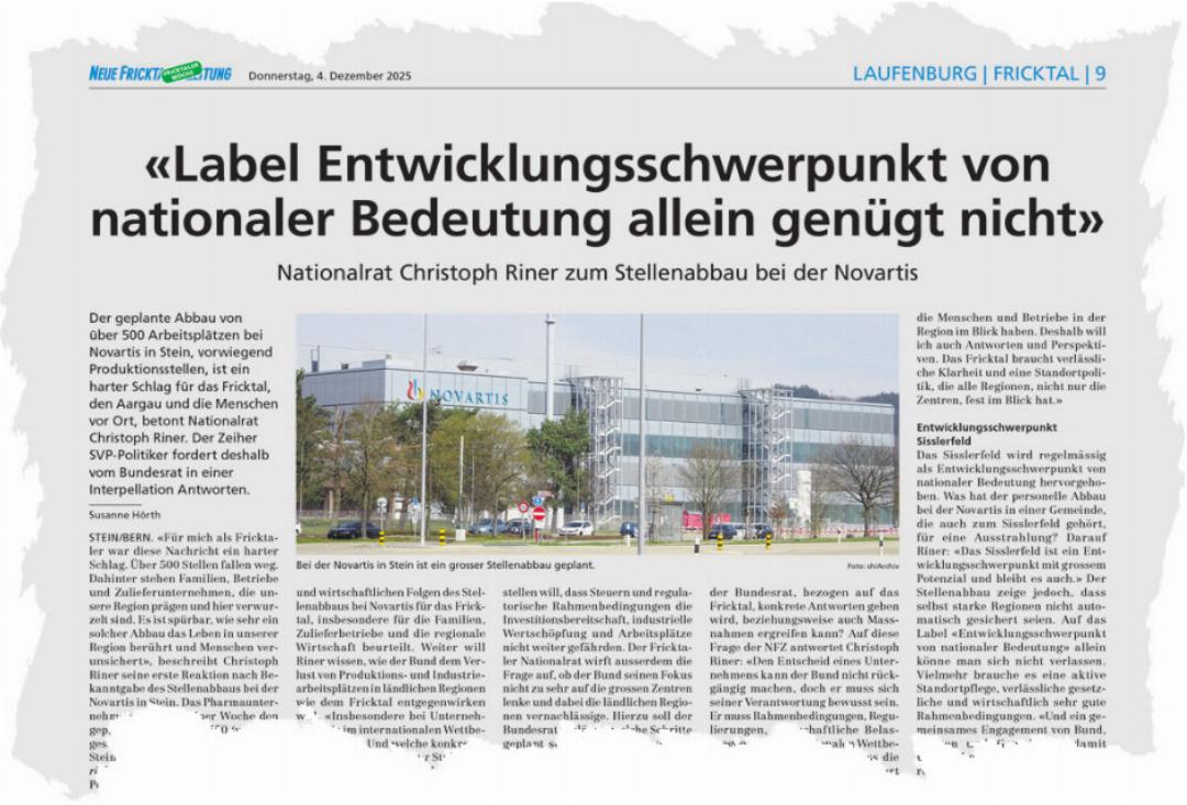 Der Bundesrat hat auf eine in der Wintersession 2025 eingereichte Interpellation zum Stellenabbau bei Novartis in Stein reagiert. Mit den Antworten ist SVP-Nationalrat Christoph Riner aus Zeihen nur teilweise zufrieden und reichte aktuell einen neuen Vorstoss ein.