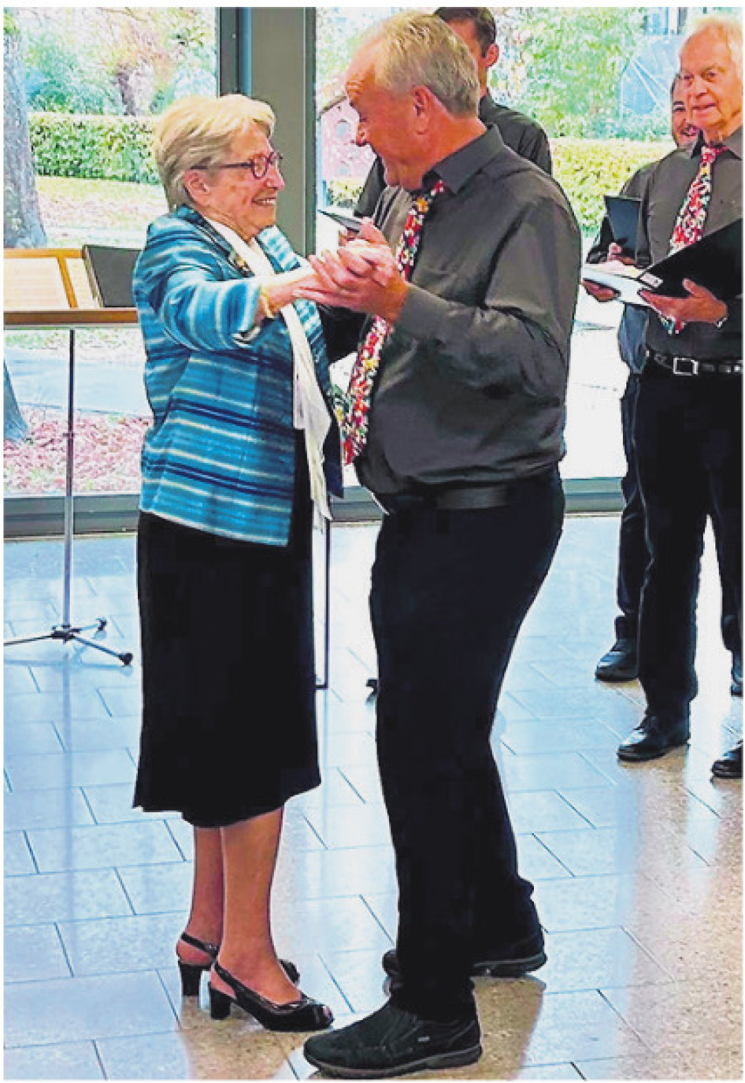 13.11.2025 FrickDorli Suter aus Frick hat am 3. November bei guter Gesundheit ihren 100. Geburtstag gefeiert. 40 Jahre führte Dorli Suter mit ihrem Mann Hans das Papeterie- und Spielwarengeschäft an der Hauptstrasse in Frick. Heute lebt sie noch immer selbständig in ihrer Alterswohnung im Alterszentrum Bruggbach in Frick. Am Sonntag, 2. November, brachte ihr der Männerchor Frick ein wunderbares musikalisches Ständchen, zu dem auch die Mieter und Mieterinnen sowie ihre Familie eingeladen waren. Zum Lied «Bajazzo» tanzte sie sogar mit dem Präsidenten Peter Boss einen beschwingten Walzer. Gemeindeammann Daniel Suter überbrachte, im Namen der Gemeinde Frick und des Kantons, mit Blumen die besten Glückwünsche für weiterhin gute Gesundheit. (mgt)