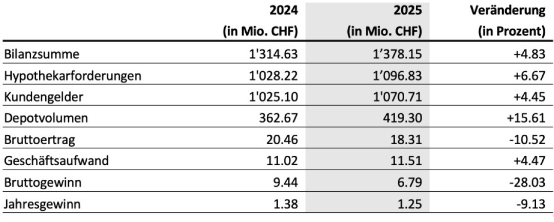 Der Geschäftsaufwand ist im Berichtsjahr auf 11,5 Millionen Franken (+4,5 Prozent) gestiegen, liegt jedoch unter Budget. Der Sachaufwand stieg aufgrund des Jubiläums im Jahr 2025 von 4,8 auf 5,0 Millionen Franken. Der Personalaufwand erhöhte sich gegenüber Vorjahr um 5,0 Prozent und ist auf einen höheren Personalbestand sowie Investitionen in die Weiterbildung zurückzuführen. Der Jahresgewinn beträgt 1,3 Millionen Franken, dies sind 9 Prozent weniger als im Vorjahr.