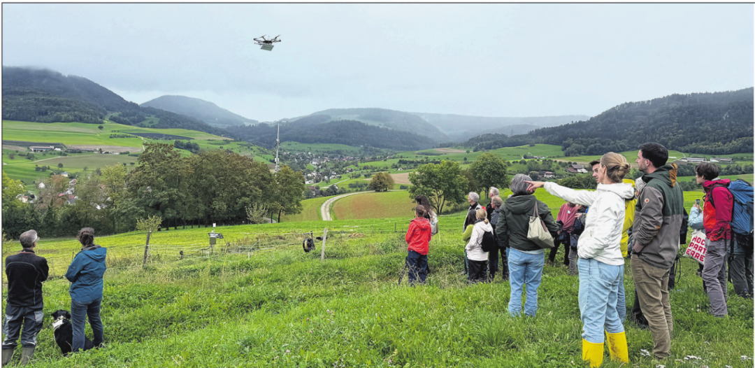 Silvia Tobias war am Montagnachmittag auf den Altenhof nach Wölf linswil gekommen, um zusammen mit Isabelle Zutter (Projekt-Koordinatorin Jurapark), Lars Horvath (Spin-off-Gründer und Drohnenpilot), Anna Leuteritz und Manfred Stähli (WSL) im Rahmen des Reallabors rund 40 Interessierte aus der landwirtschaftlichen Praxis und der ETH-Forschung über erste Versuche beim Realexperiment «Keyline – Vom Regen zur Ressource Wasser» zu informieren. In diesem Realexperiment untersuchen Forschende die Bodenfeuchtigkeit in einer Tiefe von zehn Zentimetern mit Drohnen und Bodensensoren und entwickeln Hilfsmittel zur Lenkung von Regenwasser und zum Schutz der Landschaft vor Erosion.