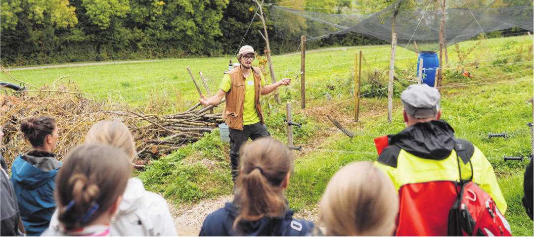 Leander Dalbert, Landwirt EFZ und Co-Betriebsleiter bei ArboVitis, hat auf dem Altenhof einen ersten Graben angelegt und entlang der Keyline unter anderem Hochstamm-Haselbäume gepflanzt. Die Fruchtbarkeit des Bodens werde zunehmen, die Humusschicht auf dem Acker werde nicht mehr weggeschwemmt. Ziel sei ein vielfältiger Agroforst, der auch den Tieren Schatten spenden könne.